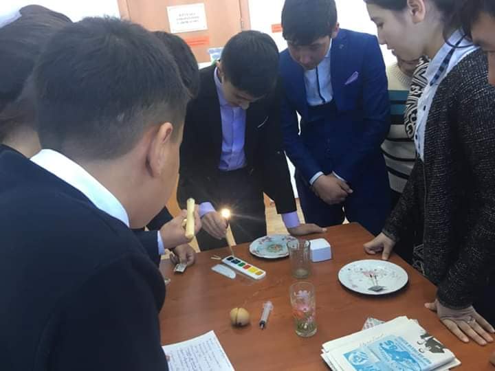 Физика сабағында зертханалық жұмыстар жүргізілуде, пән мұғалімі Р.Керейбаева