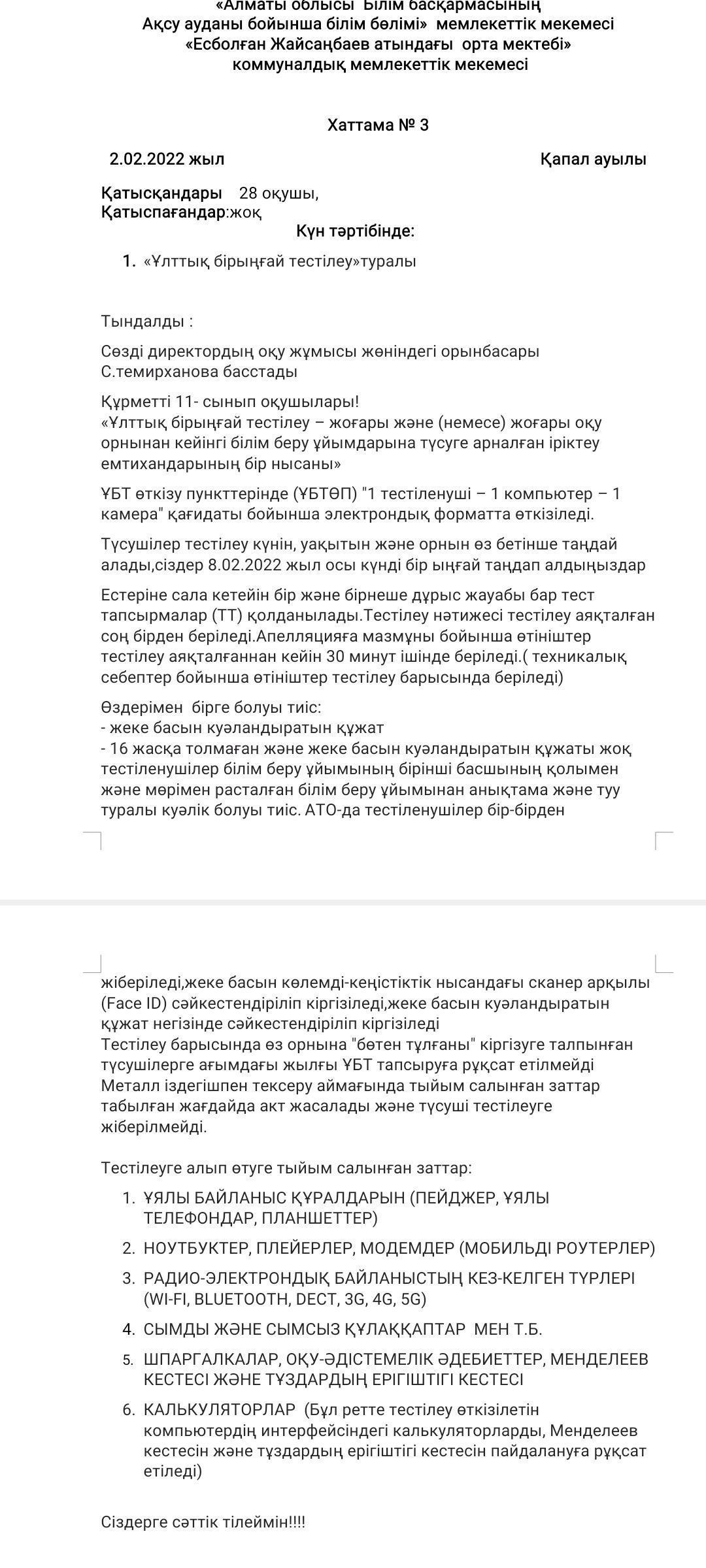 UNT » "Есболған Жайсаңбаев атындағы орта мектебі" Education Department of Kerbulak district