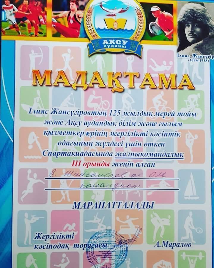 01 ноябрь 2019 0 1 2 3 4 5 Аудандық кәсіптік одағының жүлдесі үшін өткен спартакиада 27 мектеп ішінде жалпыкомандалық спартакиадасында Е.Жайсаңбаев мектебі III-орын иелендік!!